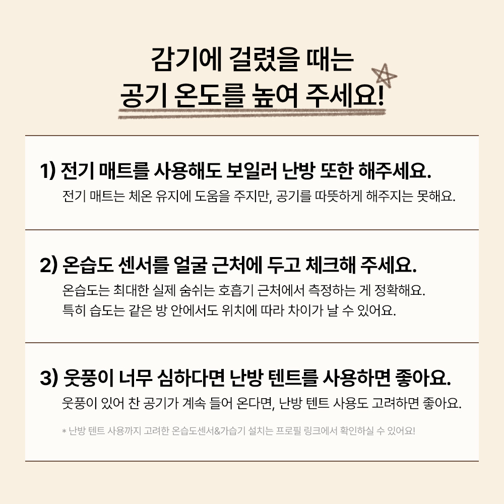 전기 매트 자체가 문제는 아닙니다. 전기 매트는 몸을 따뜻하게 해주니까요. 하지만 공기 온도를 올리지는 못해 공기는 차가웠죠. 찬 공기가 계속 호흡기에 자극을 주어 감기 증상이 잘 나아지지 않았던 것입니다.