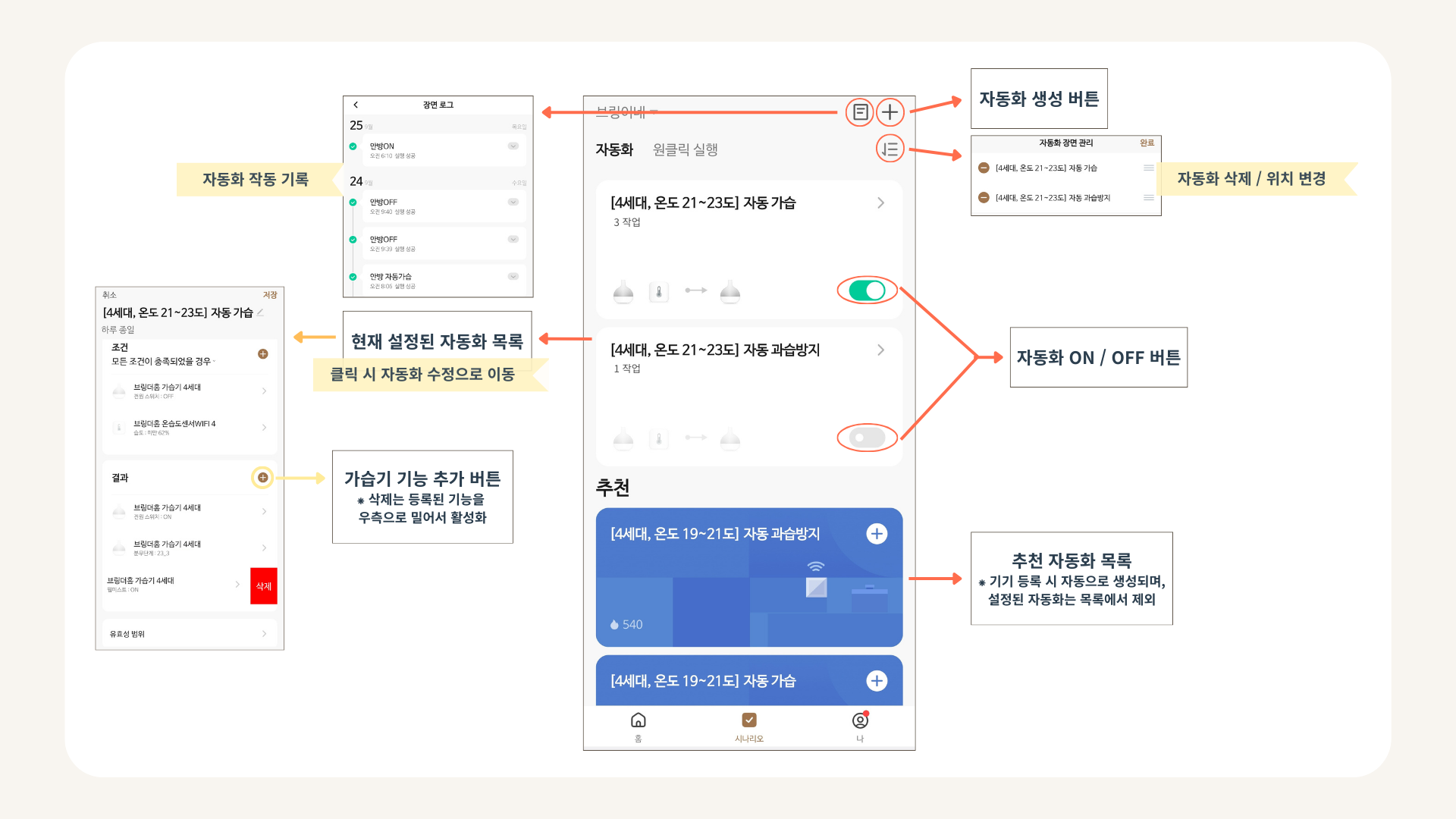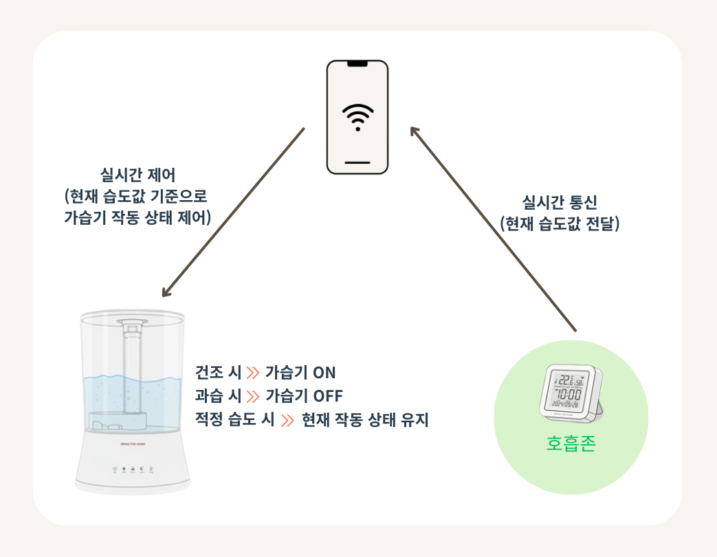 온습도센서는 실시간으로 호흡존(*사용자가 실제로 숨 쉬는 공간)의 습도값을 측정해 앱으로 전달하고 앱에서는 시나리오에 설정된 습도 구간과 현재 습도값을 비교해서 가습기의 작동 상태를 제어하게 됩니다.
