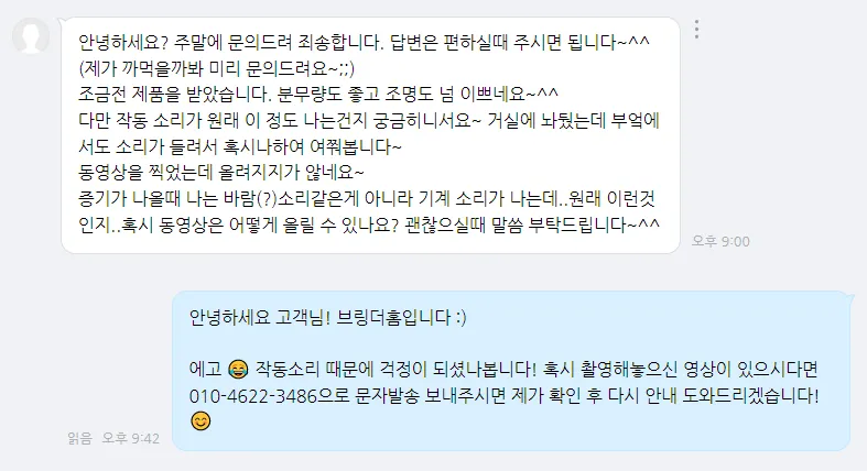 브링더홈 가습기도 여러 문의가 들어오기 시작했습니다. 처음에는 믿기지 않았어요. 아버지와 제가 심혈을 기울여 만들었으니까요. 하지만 CS를 통해 접수되는 고객님의 목소리는 명확했습니다.