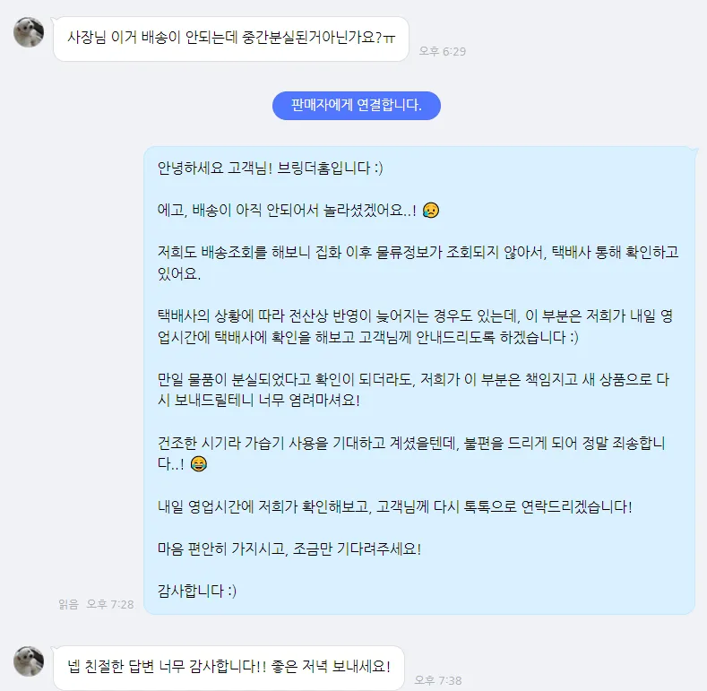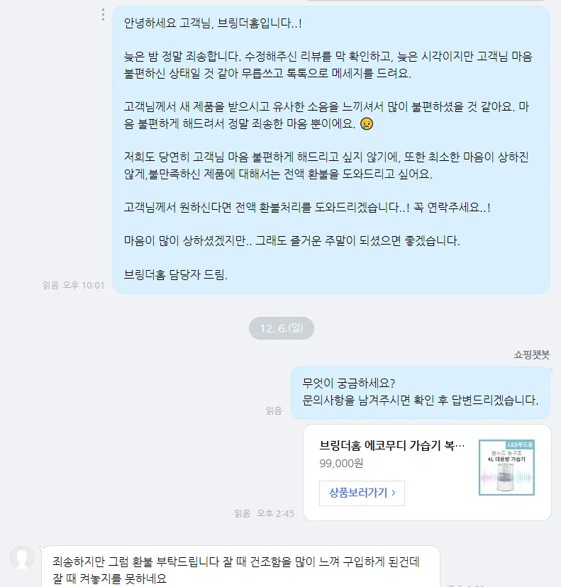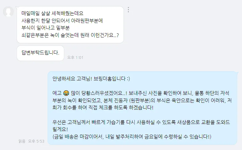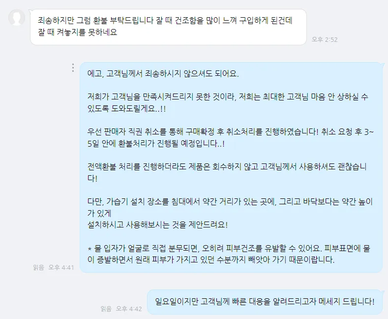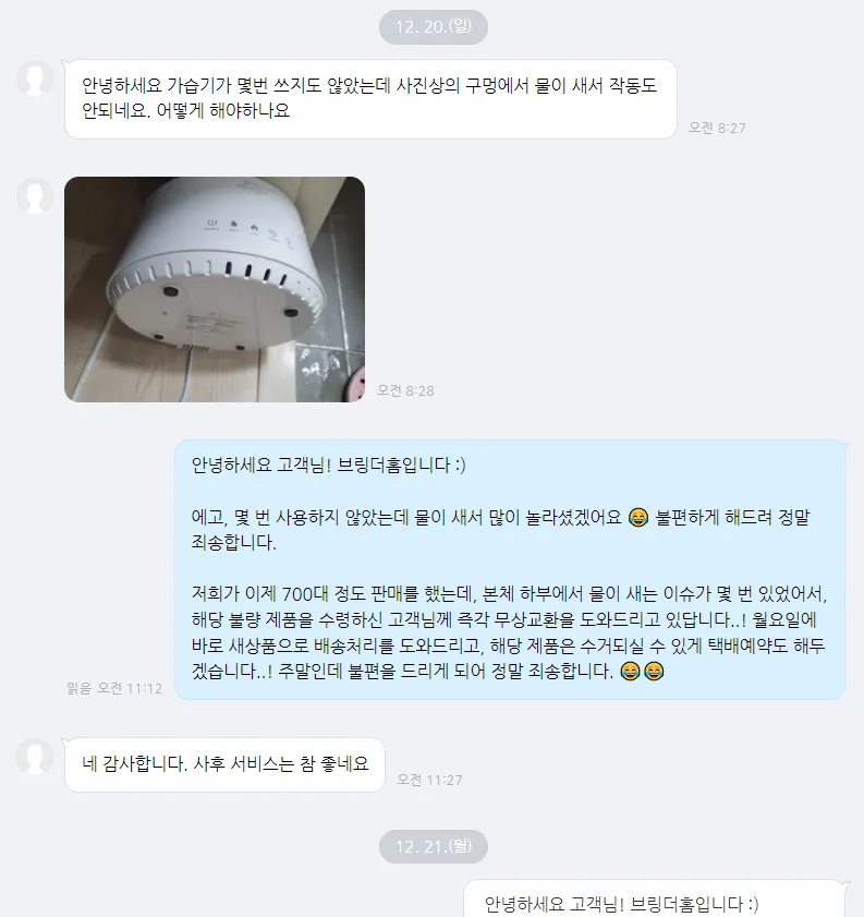 코막힘이 심한 아이를 위해 브링더홈 가습기를 구매하셨던 고객님. 가장 빠르게 해결을 도와드리기 위해 일요일 오후에 고객님께 직접 새 제품을 교환드렸었습니다. 좋은 경험만 드리고 싶지만 의도치 않게 불편을 드리게 되면 죄송한 마음이 가득합니다.