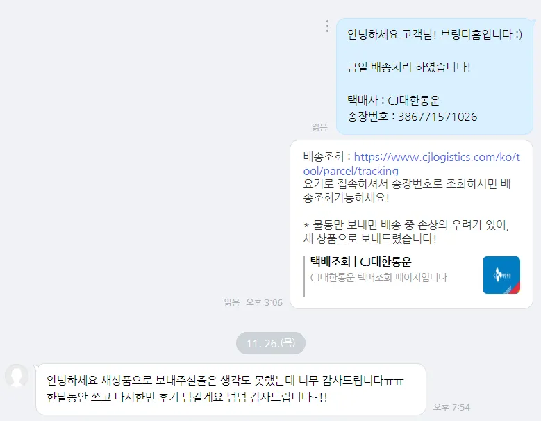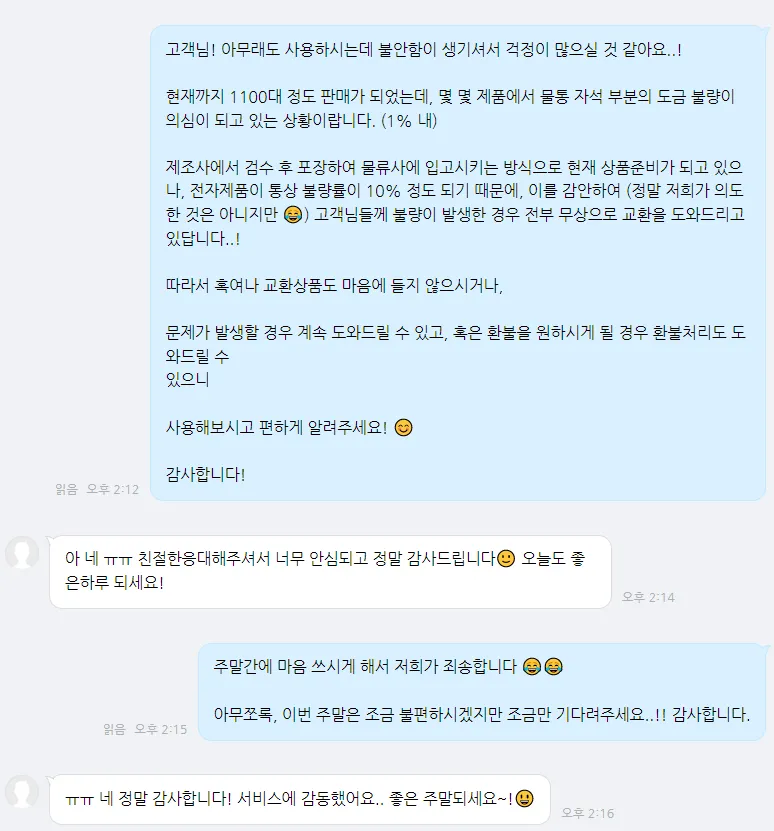 그래서 더 고객님들에게 공감하고, 제품 문제가 생겼을 때 진심을 다해서 AS를 진행했습니다. 이미 제품 문제로 불편을 겪으셨으니, 우리의 응대가 이를 덜어주어야 한다고 생각했어요. 그래서 제품 문제가 접수되면 곧 바로 새제품 교환을 도와드리게 시작했습니다.