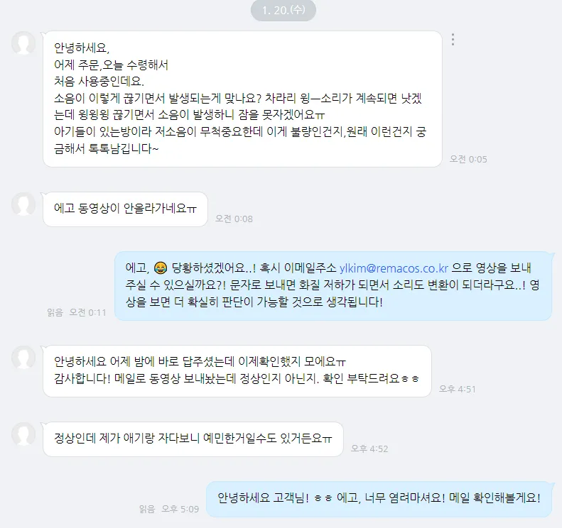 초기에 가장 큰 이슈는 [소음]이었는데요. 습도를 빠르게 올리기 위해 분무량을 높이는 개선이 들어갔는데, 이 때문에 다소 작동음이 있던 것입니다. 그리고 몇몇 제품에서 이 증상이 특히 심했고, 우리는 이를 불량으로 판단했습니다.