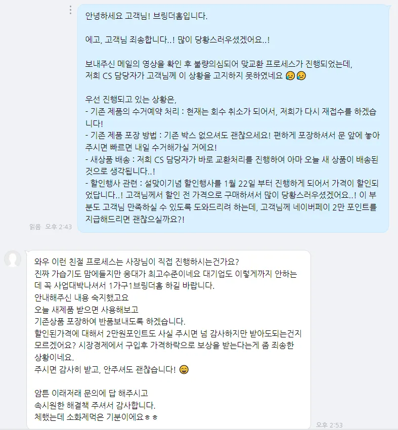 [제품 불량이 있을 순 있어도, 고객 만족은 100%여야 한다] 라는 브링더홈의 영혼은 이 때부터 생겼답니다.