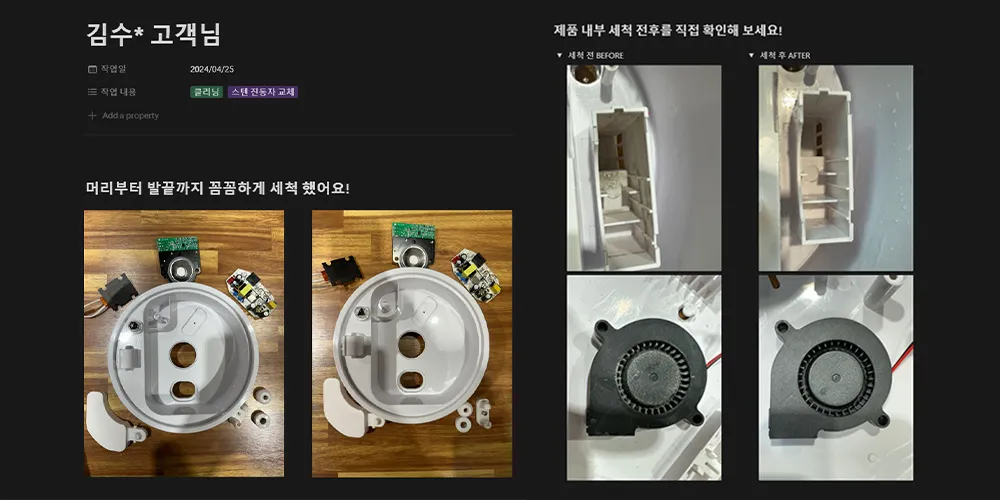 또한 클리닝을 마치고 후 발송할 때, 클리닝 전/후를 담은 안내 카드 링크를 같이 보내드렸습니다. 클리닝을 받고 겉은 깨끗해진 것을 확인할 수 있어도, 내부는 어떻게 확인할 방법이 없으니까요. 그래서 이에 대한 안내와, 우리가 이렇게 잘해드렸다는 자랑(?)을 위해 안내 카드를 첨부해 드렸습니다. 매 제품마다 직접 촬영해 카드를 작성해야 하는 만큼 손이 더 많이 가게 되었지만요.