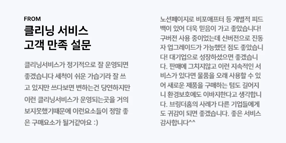 물론 지금 당장 클리닝 서비스를 상시 운영하기에는 현실적으로 부족한 점이 많습니다. 하지만 꼭 이를 정식 서비스로 만들 거예요. 클리닝 서비스는 브링더홈다운 서비스이니까요.