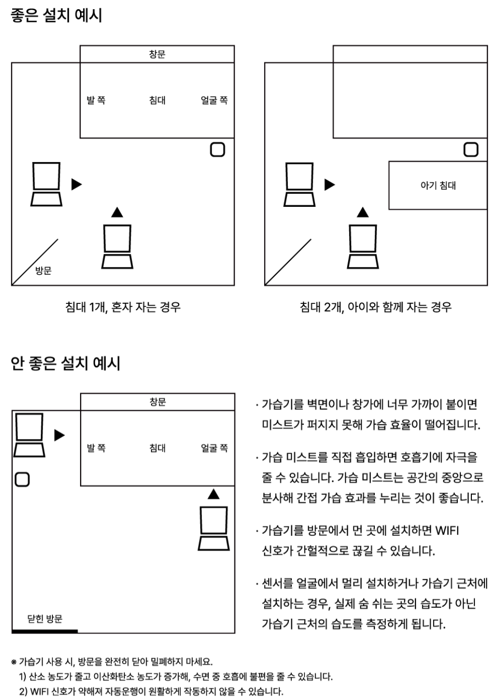• 가습기 : 호흡기로부터 2m 거리에 두고 미스트 방향은 발치로 쏘아줍니다.