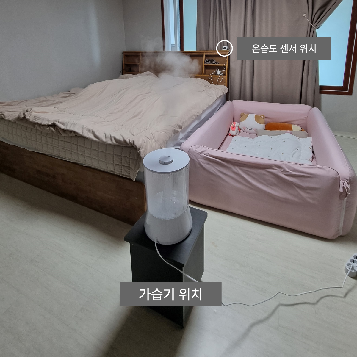 • 가습기 : 호흡기로 부터 2m 떨어뜨려 주시고, 공간이 나지 않을 경우 분무 방향과 분무량을 조절하여 가습입자가 아이에게 직접 닿지 않도록 해주세요. 침대 높이에 따라 스툴을 활용하여 가습기의 설치 높이도 높여 주세요. 낮은 침대, 베이비룸, 아기 펜스 등을 사용 중이라면 바닥에 두고 사용하셔도 좋습니다.