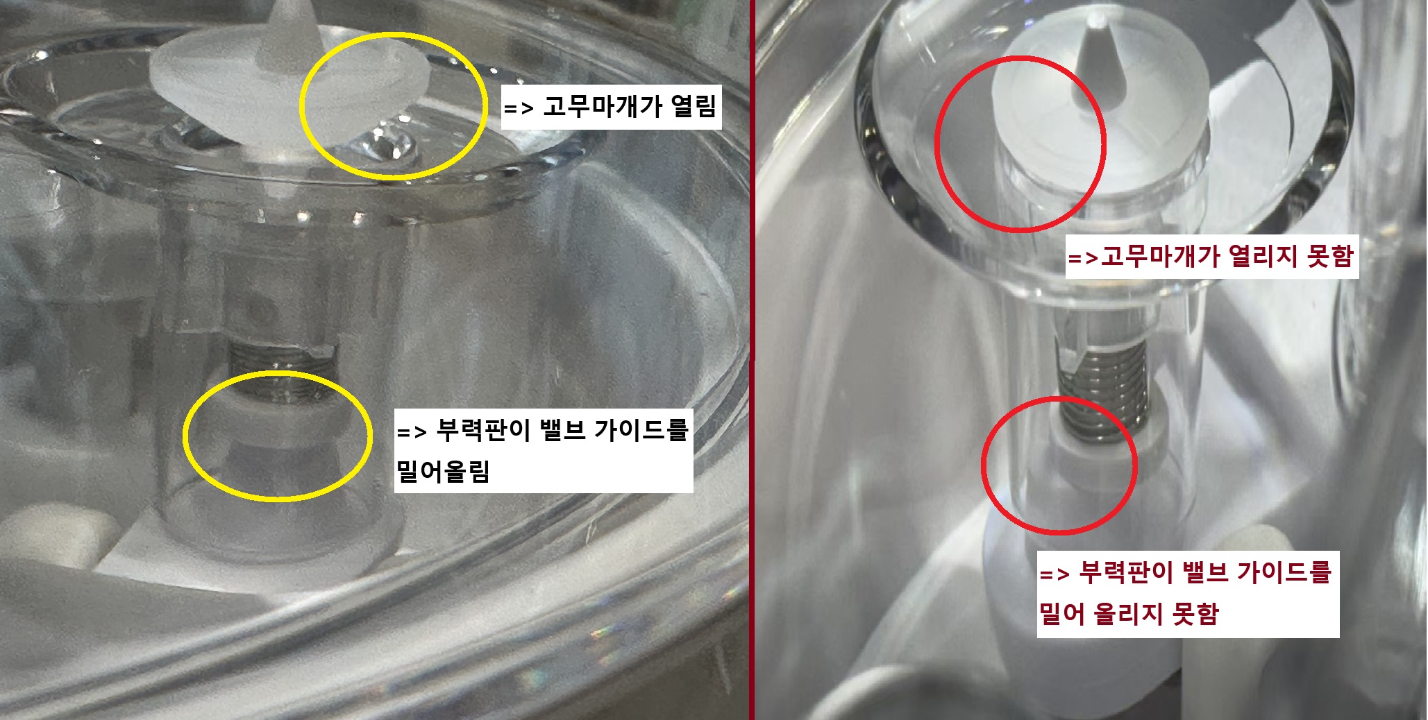 ☑️부력판의 뾰족한 부분이 밸브 사이에 끼어있는 경우, 급수가 원활하지 않을 수 있어요!