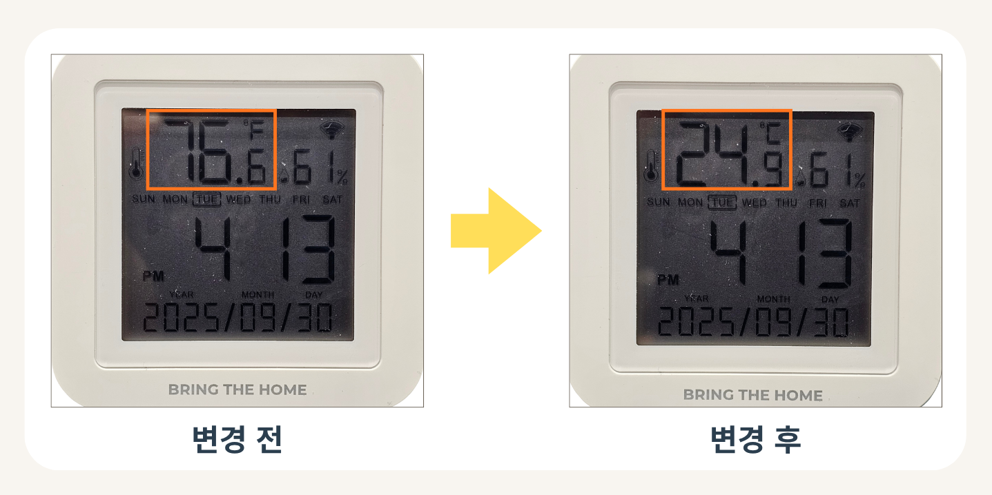 다만, 전원이나 와이파이가 재연결되면 온도 단위가 초기화되며 다시 ℉(화씨)로 표시가 돼요.