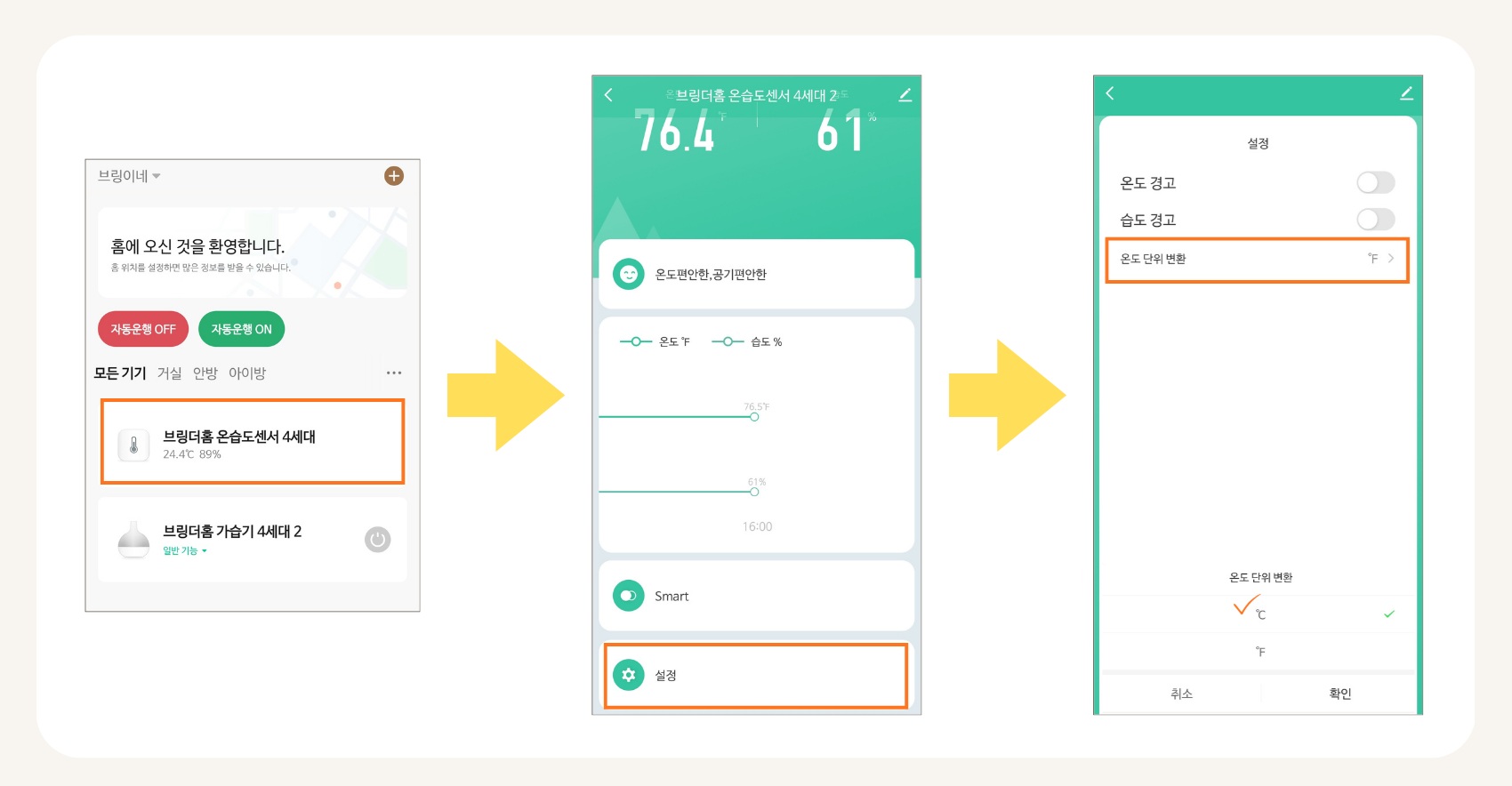 브링더홈의 IoT 스마트 온습도센서의 초기 온도 단위는 ℉(화씨)로 표시가 돼요.